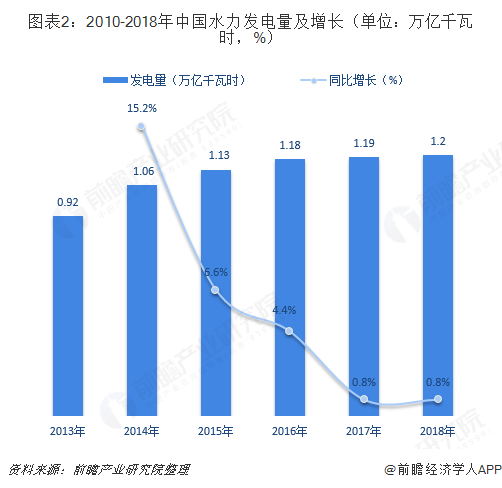 经过长时间的发展,我国水力发电行业已取得全球领先地位。数据显示,截至2018年底,我国水电总装机容量约3.5亿千瓦,同比增长2.6%,年发电量约1.2万亿千瓦时,同比增长0.8%,两项指标均稳居世界第一。
