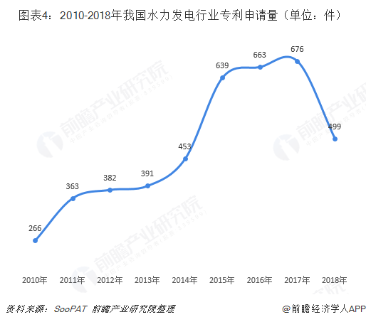 从专利申请数量来看,我国水力发电技术进步较快,专利申请数量逐步增长。根据SooPAT数据统计,2010年水力发电相关技术专利数量还仅为266件,到2017年时年申请数量已经达到676件,2018年申请量为499件。