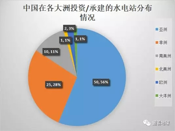 这些水电站分布于全球六大洲,其中亚洲占比最大,投资/承建的数量有50座,占到总数的50.56%;其次是非洲,占到25.28%,投资/承建的数量有25座;南美洲投资/承建的水电站有10座,占10.11%;欧洲投资/承建的水电站有2座,占2.3%;北美洲和大洋洲投资/承建的水电站都是1座,占1.1%。